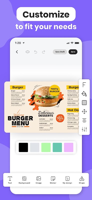 ◆ الخلفيات والملصقات: اجعل قوائمك شخصية عن طريق إضافة الخلفيات والملصقات التي تتناسب مع مظهر مطعمك.