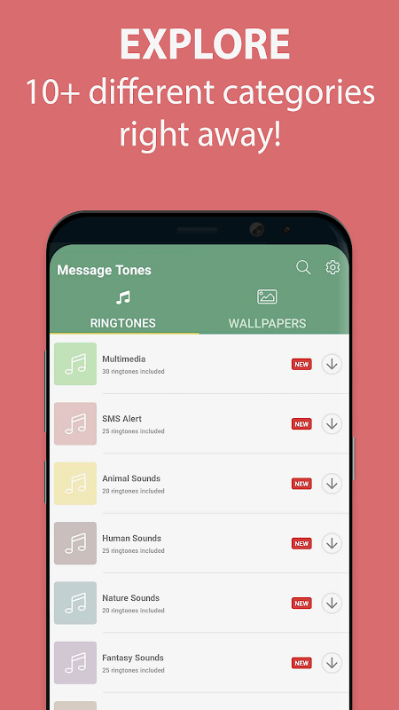 ولكن هذا ليس كل شيء! نغمات الإشعارات ونغمات الرسائل القصيرة ليست الأشياء الوحيدة التي يمكنك تغييرها عندما تحمل تطبيق نغمات رسائل. يوفر تطبيق نغمات رسائل الكثير من الأمور الأخرى! عند تحميل هذا التطبيق، سوف تحصل على أكثر من 300 خلفية ذات دقة عالية لهاتفك المحمول! لذلك، سوف تحصل على أفضل الصور موزعة على 10 فئات مختلفة على الفور! أليس هذا التطبيق رائع؟