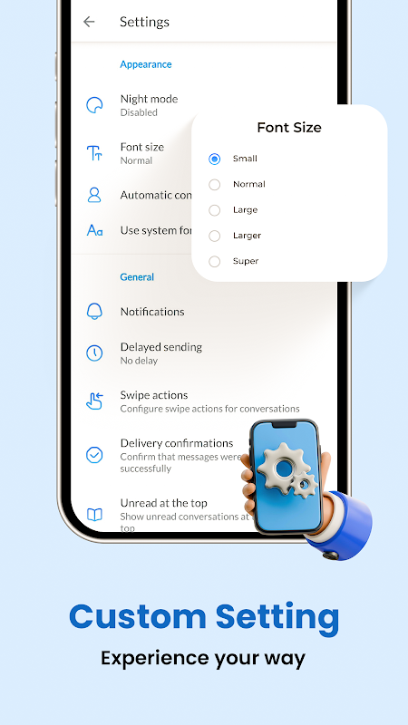 صمّم تجربة التطبيق بما يناسب احتياجاتك من خلال أحجام الخطوط، وخيارات السمات، وتفضيلات الإشعارات. استمتع بالمراسلة على طريقتك مع إمكانية التخصيص الكامل.