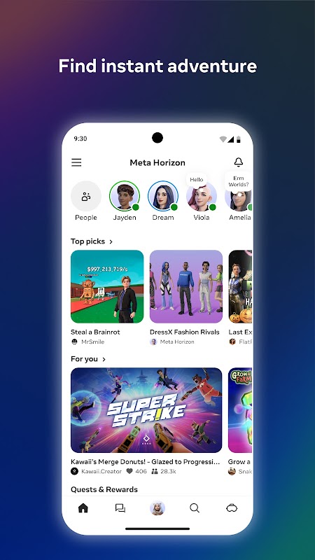 يُسهّل تطبيق ميتا هورايزون على الهاتف اللعب والتواصل مع الأصدقاء أينما ومتى شئت.