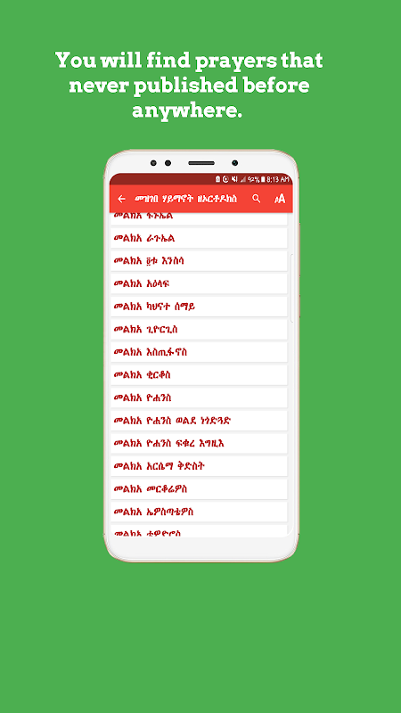 Mezgebe Haymanot هو تطبيق المحمول مع مجموعة ضخمة الكنيسة الإثيوبية الأرثوذكسية Tewahedo كتب الكنيسة. يحتوي التطبيق على أكثر من 200 كتاب الأرثوذكسية مع فئات متعددة. يحتوي التطبيق على العديد من كتب الصلاة ، والطقوس ، والمزامير ، والأناشيد ، والألحان ، والخدمات ، والأسرار المقدسة للكنيسة الأرثوذكسية الإثيوبية. كتب ترنيمة القديس يارد ، الكتب الليتورجية ، كتب أبا جيورجيس زيجاسيتشا ، صلوات القديسين والملائكة ، تعليقات الكتاب المقدس ، الكتب الكنسيّة ،