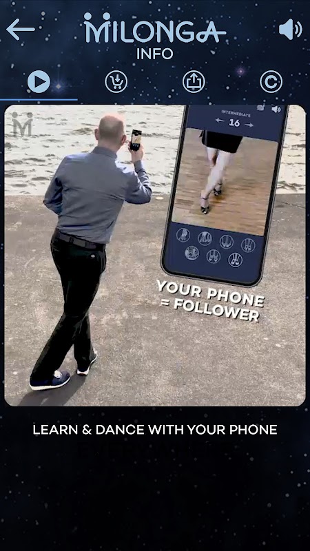 أولاً، قم بتثبيت تطبيق Milonga. إذا استمتعت بأول 3 دروس مجانية (كاملة)، فقم بشراء الدورة الكاملة. استخدمه في أي وقت وفي أي مكان - حتى دون الاتصال بالإنترنت - لممارسة تقنية Milonga وتحسينها وإتقانها. -
