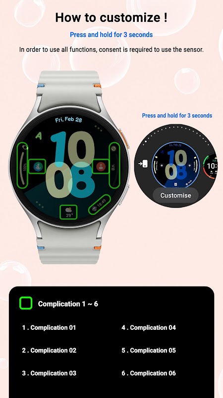 اضغط مع الاستمرار على وجه الساعة > 2. انقر فوق الزر "تزيين" > 3. انقر فوق كل منطقة تعقيد لتعيين المعلومات المقابلة > 4. انقر فوق "موافق"