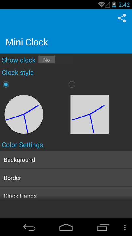 Mini clock which will be display top of all the screen. Its an customizable clock you can change the shape, background color, border color and hands color whatever your want.