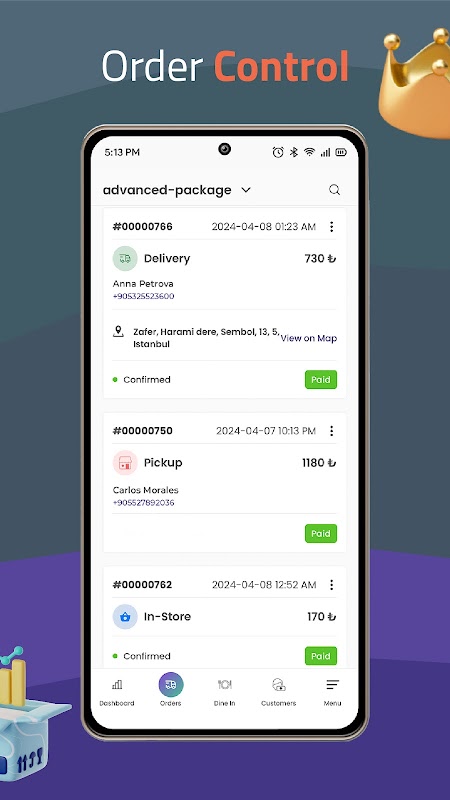 لكن ميني داين لا يتوقف عند هذا الحد. تم تصميم نظام إدارة الطلبات الخاص بنا مع أخذ الكفاءة والراحة في الاعتبار. تتبع الطلبات بسلاسة، سواء كانت صادرة من خلال الحضور المباشر أو من منصات عبر الإنترنت. عرض معلومات الطلب التفصيلية، بما في ذلك عناوين التسليم، ومبالغ الطلب، والتواريخ، وأرقام الاتصال بالعملاء، وأي ملاحظات خاصة - وكلها يمكن الوصول إليها بسهولة من خلال واجهة التطبيق البديهية.