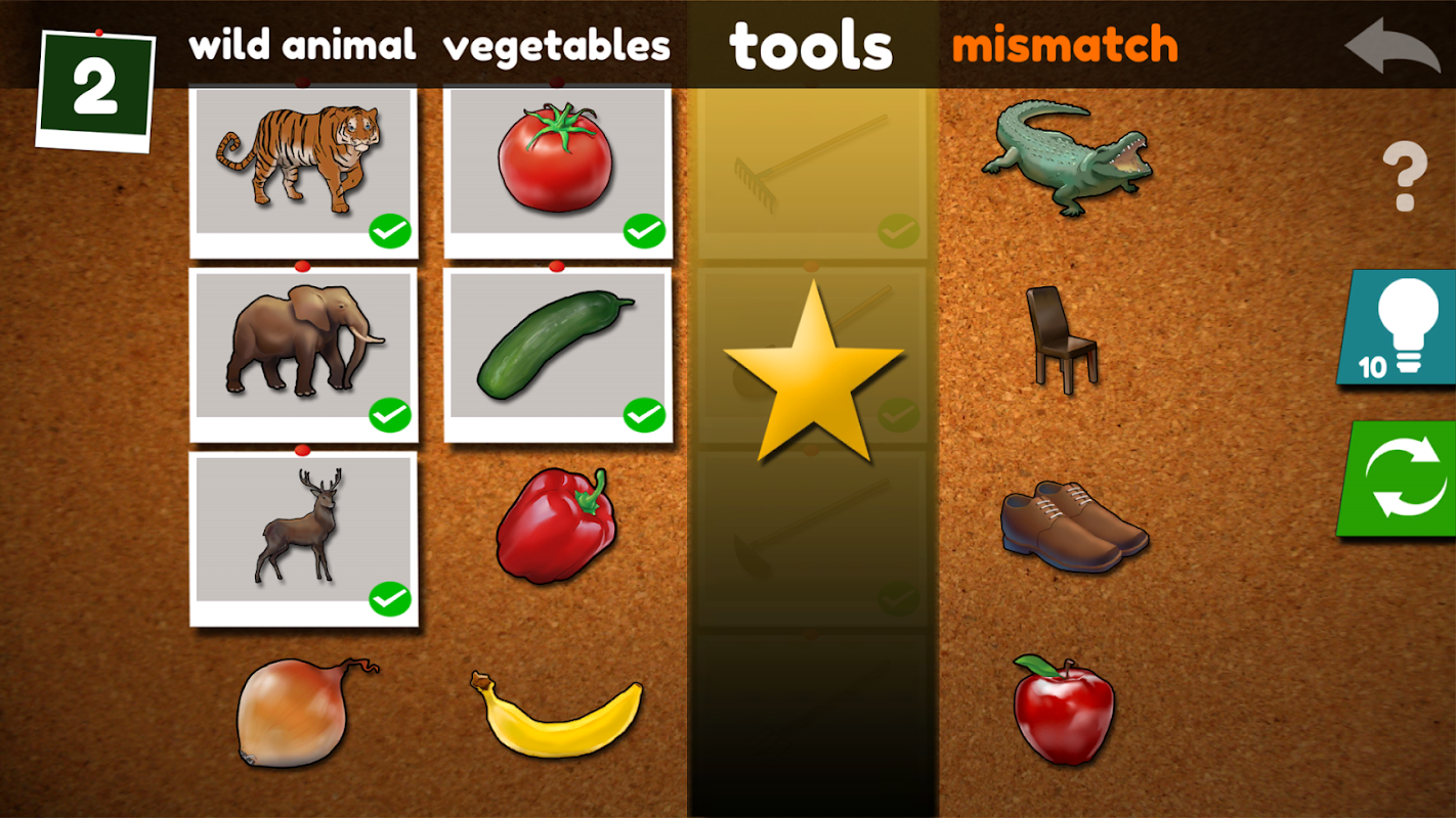 يمكنك تشغيل حزم المستوى بالكامل في الوضع السهل (حيث تعرف أسماء الفئات ولديك 5 عناصر مثبتة بالفعل في الفئات) أو الوضع العادي (حيث لا تعرف أسماء الفئات ولكن لديك 5 عناصر ثابتة) أو الوضع الصعب ( أنت وحدك لا شيء للمساعدة باستثناء تلميحات).