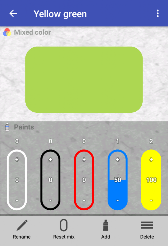 إذا حاولت مزج الألوان في هذا التطبيق قبل مزج الدهانات الفعلية ، يمكنك بسهولة معرفة النسبة المئوية للخلط لجعل اللون المطلوب.