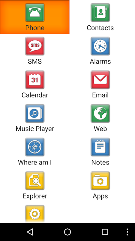 - A simplified suite of 13 accessible applications (Phone, Contacts, SMS, Alarms, Calendar, Email, Music Player, Web, Where am I, Notes, Explorer, Apps and Settings) specifically designed for the blind and visually impaired. They feature: