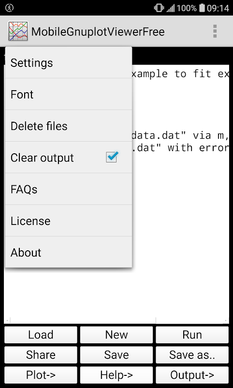 يستخدم Gnuplot نافذة shell لإدخال أوامر نصية تفاعلية ونافذة إخراج لإظهار الإخراج grapical في وقت واحد. على جهاز محمول مثل الهاتف الذكي أو الكمبيوتر اللوحي ، فإن سير العمل هذا غير مناسب ، نظرًا لأن المستخدم لديه شاشة صغيرة فقط ، فمن الصعب أن يكون لديك أكثر من منطقة إدخال / إخراج واحدة على الشاشة. لاستخدام برنامج gnuplot الممتاز على جهاز محمول ، قمت بكتابة هذا التطبيق.