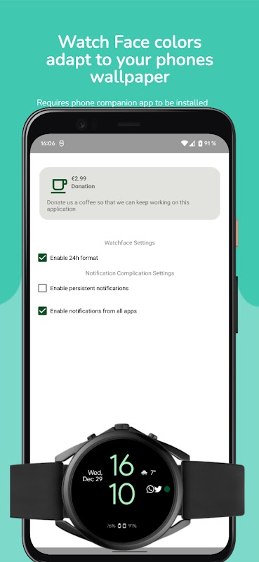 وجه الساعة ذو المظهر البسيط الذي يعكس أيقونات الإشعارات بهاتفك ويتكيف مع ألوان خلفية هاتفك (تتطلب هذه الوظيفة تثبيت تطبيق الهاتف أيضًا).