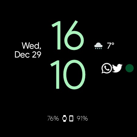 يتميز وجه الساعة بتصميم بسيط مستوحى من شاشة قفل Android 12. تتكيف ألوان وجه الساعة مع خلفية هاتفك. بالإضافة إلى الساعة ، يحتوي وجه الساعة على مساحة واحدة لتعقيد يمكن للمستخدم اختياره ويعرض لك المعلومات التالية افتراضيًا: