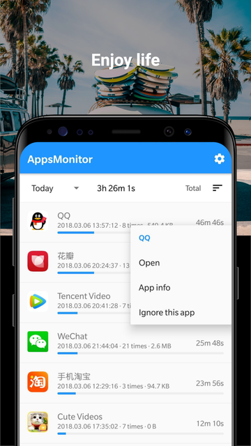 Monitory Apps provide you the great analysis of your apps usage with date and time period of each session.