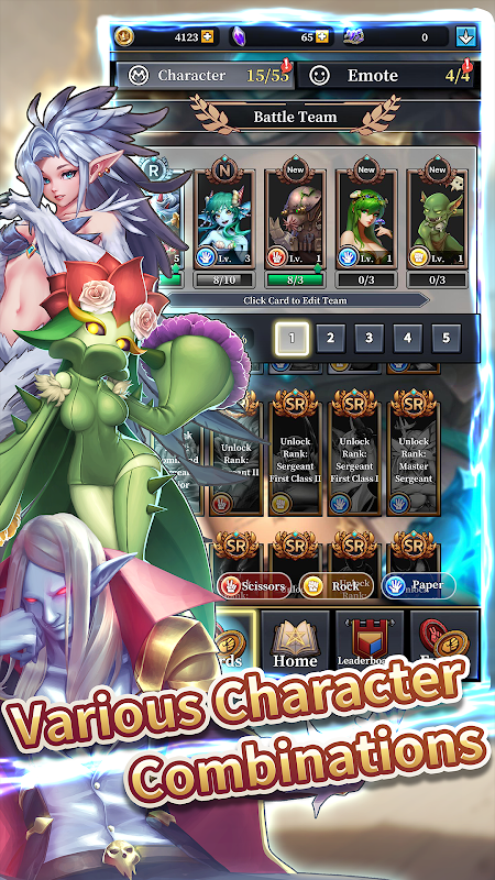 تنقسم الوحوش إلى ثلاث سمات: المقص والصخرة والورق. يمكن أن يؤدي استخدام مزايا السمات بمهارة إلى إلحاق ضرر أكبر بالخصوم. يتيح لهم إرسال ثلاثة وحوش متطابقة التواصل، مما يؤدي إلى مهارات التحرير والسرد الحصرية أثناء المعارك. تمتلك الوحوش ذات المستوى الأعلى ظروف تنشيط فريدة لقدراتها الخاصة. أتقن توقيت تفعيل المهارات وانطلق في طريق النصر.
