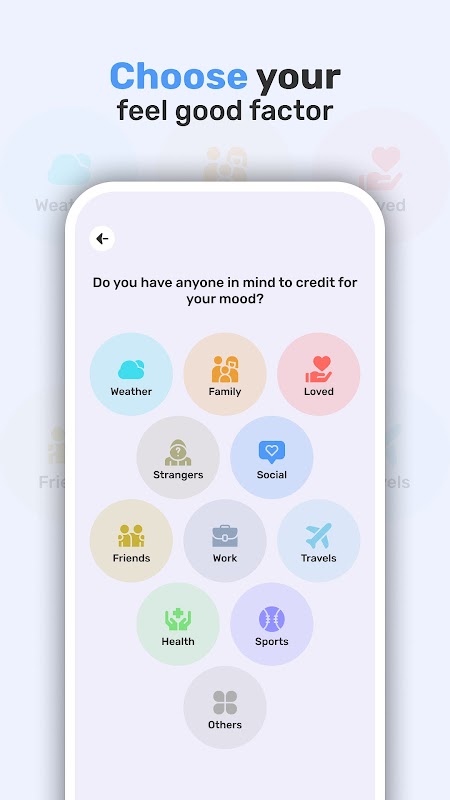 -إذا كنت تريد أن تنسب الفضل لشخص ما في حالتك المزاجية، فنحن نقدم لك خيارات. على سبيل المثال، إذا كنت سعيدًا، يمكنك إخبارنا بمن أو ما الذي جعلك سعيدًا، مثل العائلة أو الأحباء أو الطقس أو الغرباء أو التفاعلات الاجتماعية أو الأصدقاء أو العمل أو أي شيء آخر. وبالمثل، إذا كنت تشعر بالإحباط، يمكنك مشاركة السبب معنا، ويمكنك إضافة تسجيلات أو أي صور تريد إرفاقها بها.