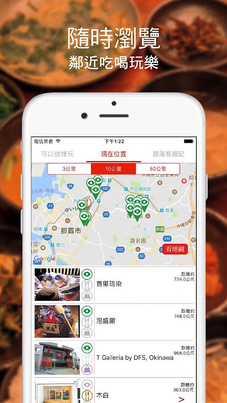 旅行時,原定計畫改變了?或是突然有了多餘的時間,隨時打開《現在位置》,周邊吃喝玩樂一目了然。針對您所在的城市給你最好玩的在地玩法、部落客遊記,就算你這一秒在台灣下一秒在義大利,都能即時掌握當地旅遊情報。