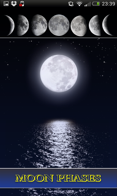 ويوفر هذا التطبيق القطعة المرحلة القمر لشاشتك الرئيسية التي تشمل الأقمار الموقف الحالي وأيضا الفلكي علامة البروج هو حاليا في. وهذا يشمل الآن قائمة من جوانب الكوكب الحالي بين بعضها البعض، وكذلك الأحداث مثل عندما الزئبق في ريتروغراد . عندما الزئبق ليس في الوراء فإنه سيشير في غضون 14 يوما من حدوث واحد القادم.
