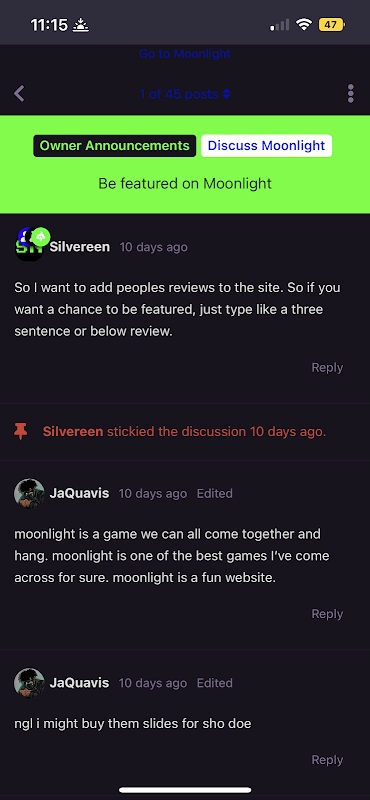 دردشة صغيرة ممتعة لموقع ألعاب Moonlight الشهير (https://moonlight.silvereen.net) حيث يمكنك الدردشة مع أصدقائك وعائلتك. تحدث عن أي شيء بما في ذلك الواجبات المنزلية أو الألعاب أو أي موضوع آخر يمكنك التفكير فيه!