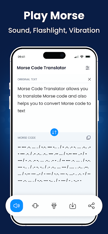 يمكنك تشغيل إشارات Morse Code في الصوت والمصباح والاهتزاز من خلال النقر على الأيقونات المعنية.