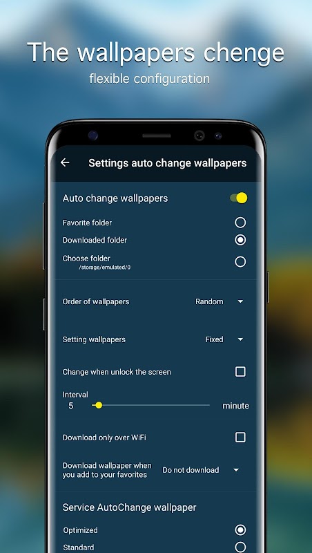 • تغيير الخلفية تلقائيًا مع الفاصل الزمني المحدد (خلفيات جبلية حية)