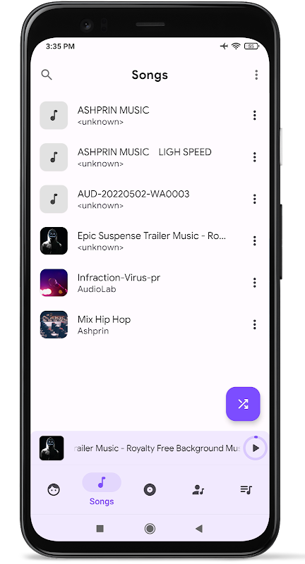 يرجى ملاحظة أن تطبيقنا هو مشغل موسيقى غير متصل بالإنترنت ، مما يعني أنه يقوم بتشغيل الموسيقى مباشرة من وحدة التخزين المحلية الخاصة بك. يمكنك الوصول إلى مكتبة الموسيقى بأكملها دون اتصال بالإنترنت ، مما يضمن الاستمتاع دون انقطاع بمساراتك المفضلة أينما ذهبت.