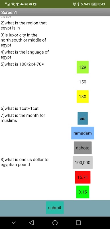 إنه تطبيق MQA حيث يقوم المستخدم بوضع اسمه والإجابة على الأسئلة وإرسالها. بعد الإرسال ، سيتم توجيههم إلى شاشة أخرى حيث سيكون هناك لوحة صدارة مع أسماء المستخدمين الذين شاركوا في هذا الاختبار ونتائجهم بجانبهم.
