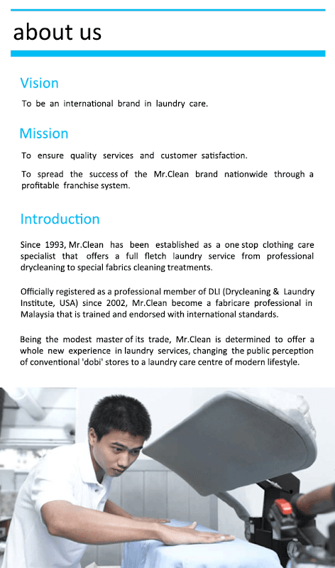 Mr.Clean came up with a revolutionary concept for the local laundry industry back in 1993. According to Mr.Clean, laundry should not only be about sending clothes to be washed and cleaned. It should be a care centre – a place where quality services are given to laundries. Since then, Mr.Clean aims to widen the ‘laundry care’ concept to more Malaysians nationwide.