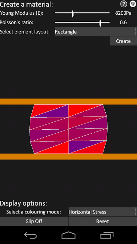 الضغط على قضبان البرتقال لاختبار ضغط المواد التي تظهر على الشاشة. يتم احتساب توزيع تشوه والضغط على الطاير وتصور. ويمكن اختيار المعلمات المادية والهندسة للجزء الاختبار. يظهر التخيل واحدة من أي من الضغوط العادية أو القص أو معيار العائد فون ميزس.