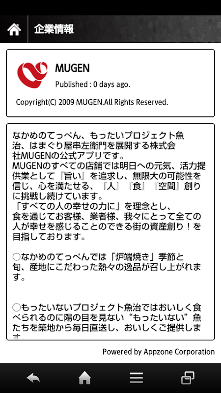 MUGENのすべての店舗では明日への元気、活力提供業として『旨い』を追求し、無限大の可能性を信じ、心を満たせる、『人』『食』『空間』創りに挑戦し続けています。
