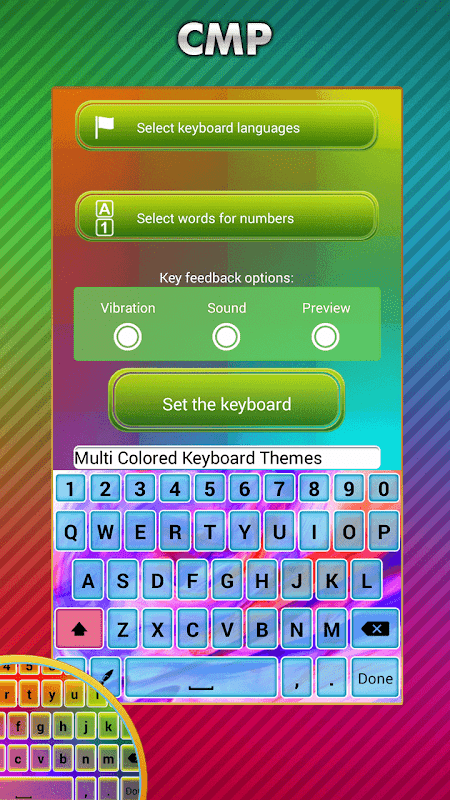 2. الرجوع إلى التطبيق، ثم حدد "تعيين لوحة المفاتيح الافتراضية ل'زر وحدد "متعدد ملون لوحة المفاتيح ثيمات؛