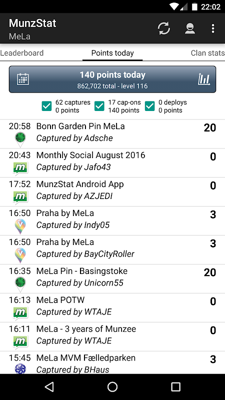 MunzStat is an Android app for the Munzee player who likes keeping up with the daily score development and activity on his or her profile. The app displays a list of activity (captures, captures on your munzees, and deploys) for today, or any other day.