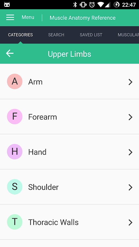 هذه التطبيقات يغطي معلومات حول كل عضلة في جسم الإنسان، ويقسم لهم حتى في 5 فئات هي: الرأس والعنق والجذع والأطراف العليا والأطراف السفلية.