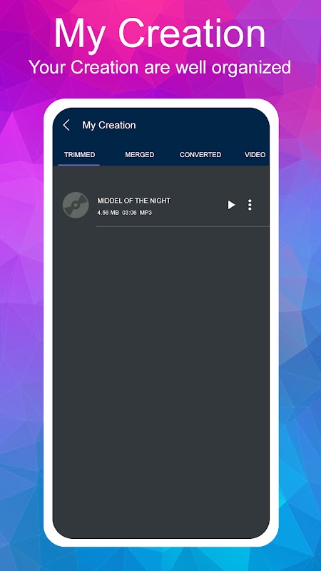 امزج بين صوتين من أي تنسيق لإنشاء ريمكسات جديدة. يمكنك تحديد جزء الصوتيات الذي تريد مزجه ويمكنك أيضًا التحكم في مستوى صوتي صوتي في المزج. مشاهدة المعاينة وحفظ المزيج الخاص بك.