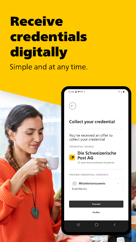 يمكنك طلب المستندات الرسمية من السلطات أو المؤسسات التعليمية أو الشركات ، واستلامها وتخزينها محليًا بتنسيق مشفر على هاتفك الذكي - كل ذلك عبر تطبيق "My Credentials" ، محفظتك الرقمية. إذا كنت ترغب في إظهار بيانات الاعتماد الخاصة بك ، فيمكنك مشاركتها مع هيئة عامة أو مؤسسة تعليمية أو شركة مباشرة وبسهولة من التطبيق.