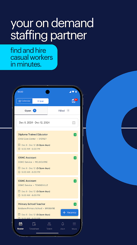 ابحث عن موظفين مؤهلين وغير رسميين لمؤسستك - بسرعة وسهولة! يتيح لك تطبيق التوظيف الخاص بنا نشر الوظائف الشاغرة والتواصل مع المرشحين المتاحين وذوي الجودة العالية على الفور. سواء كنت بحاجة إلى معلم، أو ممرضة، أو إداري محترف، أو عامل مستودع أو مؤقت لمناوبة في منطقة أخرى، فقد وفرنا لك محترفين من الدرجة الأولى بنقرة واحدة فقط. قم بإدارة حجوزاتك وتتبع مدى التوفر وملء المناوبات بسهولة، كل ذلك من منصة واحدة بديهية. لا مزيد من أوقات الانتظار الطويلة أو العمليات المملة. أصبح التوظيف المبسط في متناول يدك - متاح على مدار الساعة طوال أيام الأسبوع وفي أي وقت وفي أي مكان.