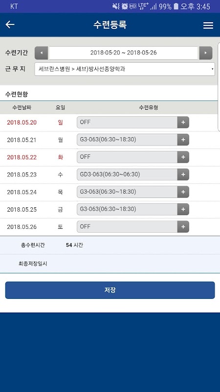 사전에 등록된 수련일정을 바탕으로 수련일정 관리, 수련유형 선택 등을 통해 전공의 개인의 수련일정 및 수련시간을 조회 및 변경하여 실제 수련일정을 관리하고 수련시간을 계측할 수 있습니다