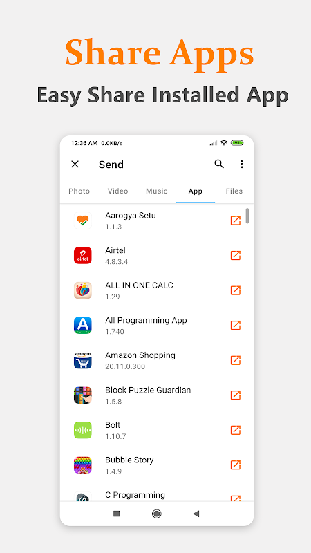 In this App you can share All kinds of file like Audio, Video, Photos, Apps, Files etc.
