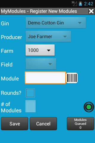 يمكن لمنتجي القطن تسجيل وحدات قطنية جديدة وإرسالها إلى محلج تلقائيًا ، مع إحداثيات GPS إذا أردت.