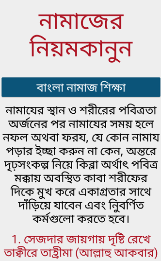 ইসলাম মুসলমানদের উপর পাঁচ ওয়াক্ত নামাজ ফরয করেছে। নামায শিক্ষা গ্রহণ করা প্রত্যেক মুসলিম নর নারীর জন্য ফরজ। আর এগুলো হল ফজরের নামাজ, যোহরের নামাজ, আসরের নামাজ, মাগরিবের নামাজ, এশার নামাজ। কিভাবে নামাজ পড়বেন তার বিস্তারিত আলোচনা করা হয়েছে।