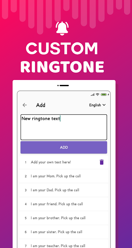 كيفية إنشاء نغمات رنين مخصصة باللغة الهندية ، يمكنك تسميتها نغمة رنين apne naam ki: انقر فوق زر إضافة في صفحة تطبيق صانع نغمات الرنين. اختر لغتك وأضف النصوص. ارجع إلى الصفحة السابقة واستخدم النص المخصص كنغمة رنين.