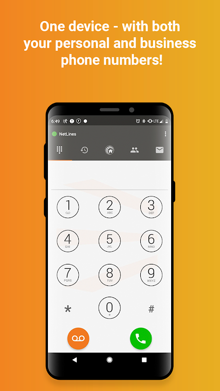 ضع خط عملك على هاتفك الذكي باستخدام تطبيق NetLines. يتيح لك NetLines إجراء واستقبال مكالمات العمل على هاتفك الذكي الحالي. يمكنك الآن الحصول على أرقام هواتف شخصية وتجارية على جهاز واحد والتوقف عن استخدام رقم هاتفك الخلوي الشخصي لمكالمات العمل. يحتوي NetLines على عدد كبير من ميزات هاتف العمل مثل مكالمات الفيديو الجماعية والرد التلقائي والرسائل النصية القصيرة والبريد الصوتي إلى البريد الإلكتروني وتسجيل المكالمات والمزيد. حافظ على خصوصية رقم هاتفك الخلوي واستخدم NetLines للأمان التام والتحكم في المكالمات. احصل عليه اليوم وشاهد ما يمكن أن تفعله NetLines لجعل التوازن بين حياتك الشخصية / العملية أفضل بكثير. NetLines - هاتف عملك أثناء التنقل.