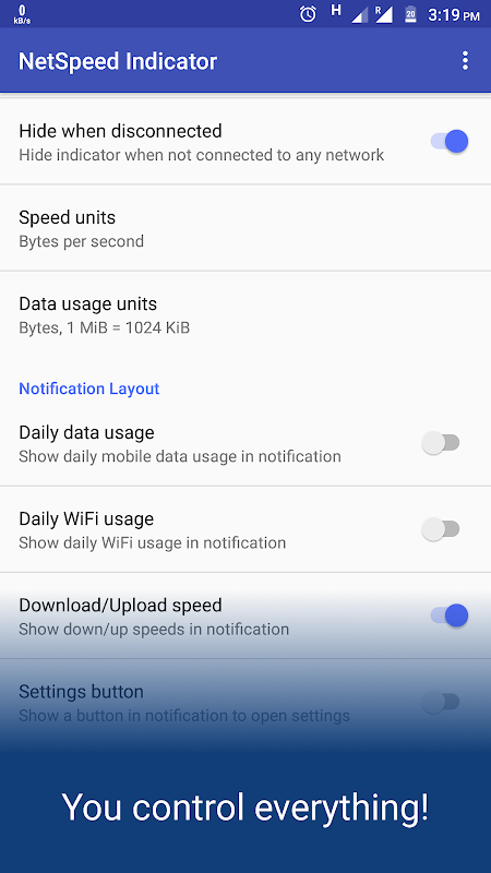 يمكنك تخصيص كل ما تريده تقريبًا. يمكنك بسهولة إظهار وإخفاء المؤشر إذا لزم الأمر. قرر من أجلك المكان الذي تريد إظهار المؤشر فيه في شريط الحالة ، ما إذا كان يجب عرضه على شاشة القفل أو ما إذا كنت تريد استخدام وحدات البايت في الثانية (على سبيل المثال kBps) أو وحدات بت في الثانية (مثل kbps) لإظهار السرعة.