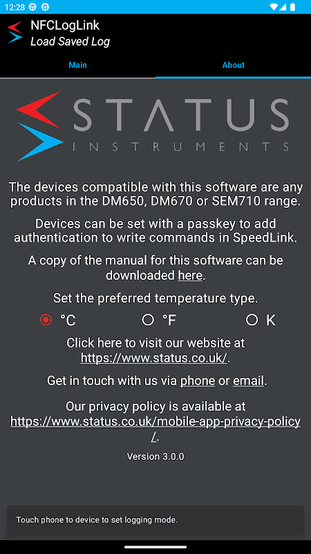 يتيح NFC LogLink الخاص بـ Status للمستخدمين استرداد البيانات عن طريق تثبيت الهواتف المحمولة والأجهزة اللوحية المتوافقة على نطاق بطارية Status. ومن خلال اتباع التعليمات السهلة التي تظهر على الشاشة، يتم استرداد البيانات في غضون ثوانٍ.