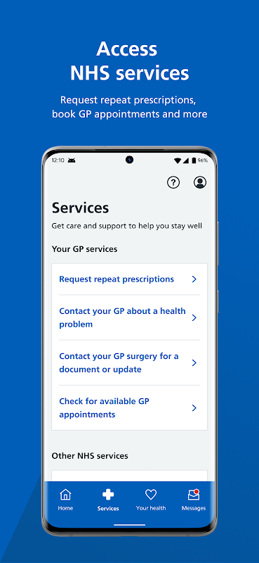 استخدم تطبيق NHS للوصول إلى خدمات NHS الخاصة بك، في أي وقت وفي أي مكان. يمكنك طلب تكرار الوصفات الطبية واستخدام 111 عبر الإنترنت والعثور على خدمات NHS القريبة والمزيد.