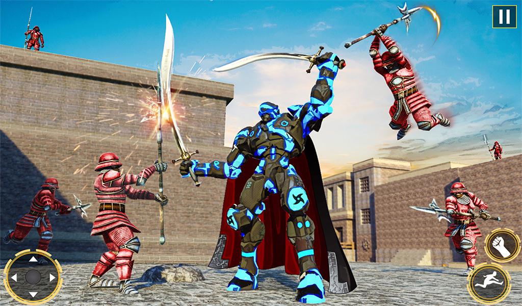 روبوت النينجا القتال مع قوى خاصة وخبرة قاتل النينجا لإنقاذ مهمة كما هو الحال في محارب النينجا الحقيقي من الظل الشديد. ترقية الأسلحة الميكانيكية روبو لزيادة قوة القتال ، والمهارات حرب مستقبلية الروبوت وتجربة قاتل النينجا في النينجا المحارب روبوت البطل: قاتل ألعاب روبوت. تثبت نفسك باعتباره بطل خارقة الروبوت النينجا النهائي واستخدام استراتيجيات وتكتيكات مختلفة لتظهر منتصرا. الأبطال الخارقين هم قاتل مقاتل يقتل جميع الأعداء المقاتلين في ألعاب محارب النينجا.