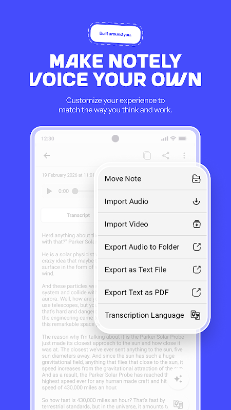 قم بنسخ وتنظيم الملاحظات الصوتية بأكثر من 100 لغة. سريع. ذكي. سهل.