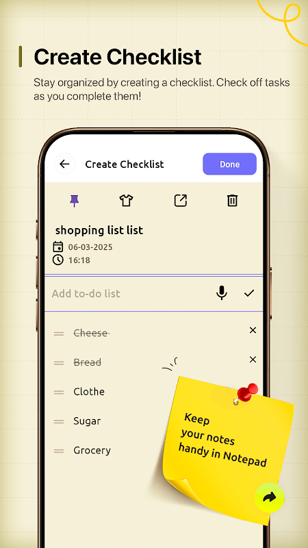 Notepad - Notes and To-Do List عبارة عن مفكرة 📱 بسيطة ولكنها قوية لنظام Android، وهي مصممة لمساعدتك في تدوين الملاحظات وإنشاء قوائم المراجعة والبقاء منظمًا دون عناء. سواء كنت بحاجة إلى تدوين الأفكار أو التخطيط للمهام اليومية أو حفظ المعلومات المهمة، فإن هذا التطبيق يوفر واجهة سهلة الاستخدام مع ميزات متقدمة.