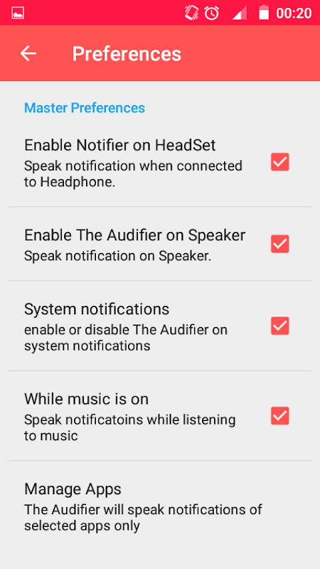 -- You can customize the preferences to speak notifications on different phone states like when connected to headphone, enable speaking on speaker, system notifications etc.