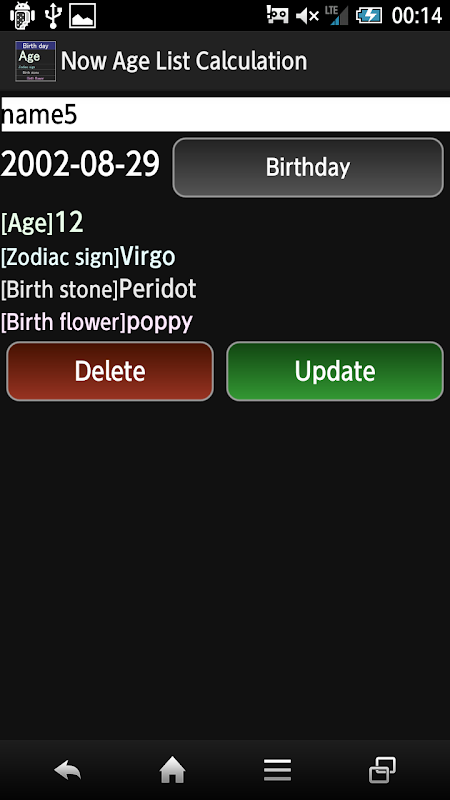 فقط يتم عرض اسم الدخل وحدد عيد ميلاد العمر، البرج علامة والحجر الميلاد وزهرة الميلاد تلقائيا.