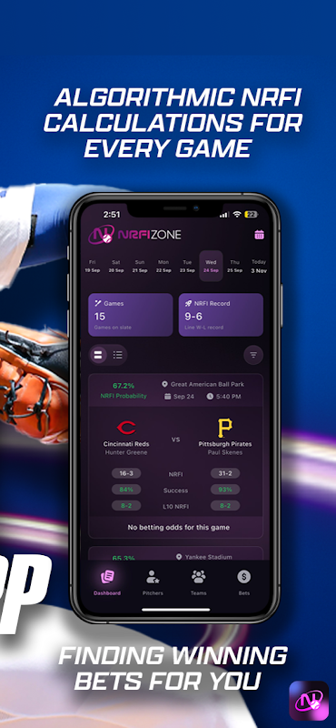 التطبيق الأول لتتبع نتائج الشوط الأول بدون ركض (NRFI) لعشاق البيسبول ومراهني دوري البيسبول الرئيسي (MLB).