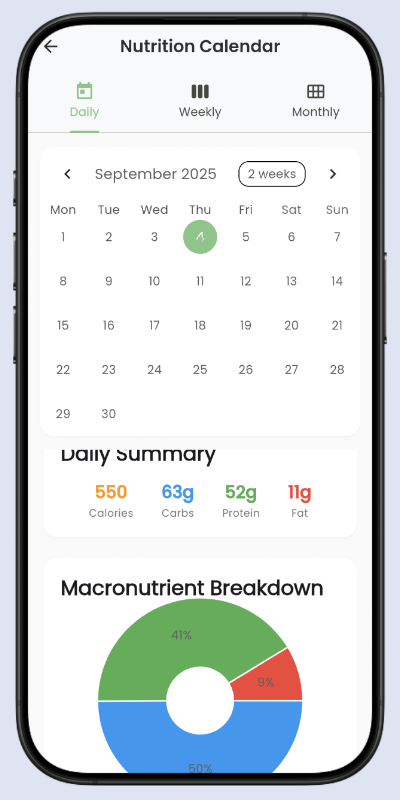 استمتع بتجربة تتبع التغذية مع واجهة أنيقة وعصرية تتميز بألوان باستيل، وتصفح سهل، وشاشات عرض كبيرة وسهلة القراءة للسعرات الحرارية.